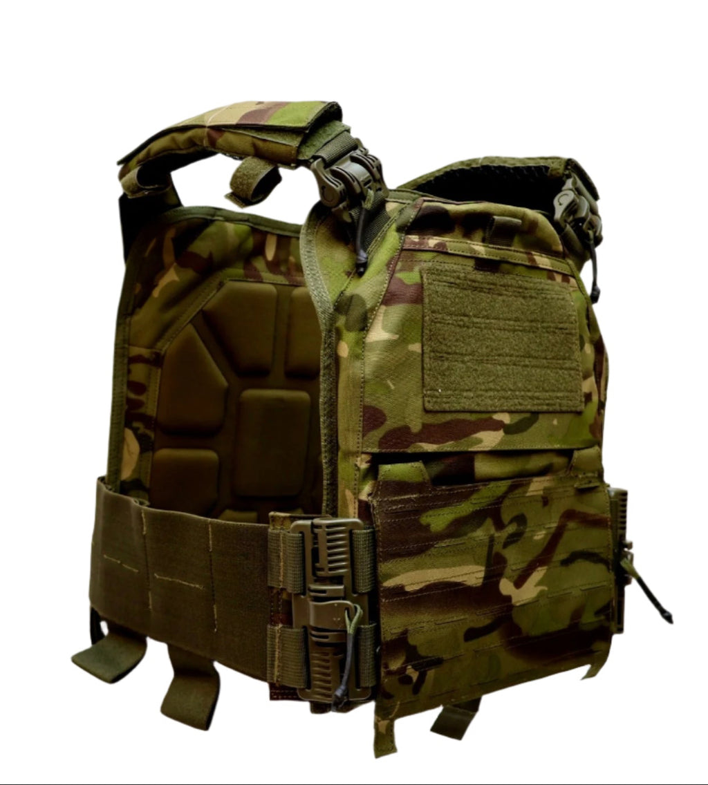 * Made with 600D fabric, durable, water resistant and lightweight * Elastic cummerbund with built-in pouches for magazines, radios or other accessories * Interior Embossed Padding For Added Protection And Ventilation * Front and back armor pockets can hold standard size plates * Emergency drag handle on the back * Laser cut design increases longevity and decreases bulk * Matching loop material on the top of front and back for attaching patches or ID panels * 3D Mesh on the inside of shoulder strap. * Detachable and adjustable cummerbund. * Store your phone, keys and other small essentials in the upper front pocket * Removable front flap can be replaced with a placard or buckle chest rig of your choice * Padded shoulder straps with additional removable wrap around pads offer extra comfort and support * Front panel can be replaced with any equipment. * Rapid Open Connectors on shoulder straps and cummerbunds. * All Stress points double stitched, Bar tacked or 'X Box' stitched for added strength.